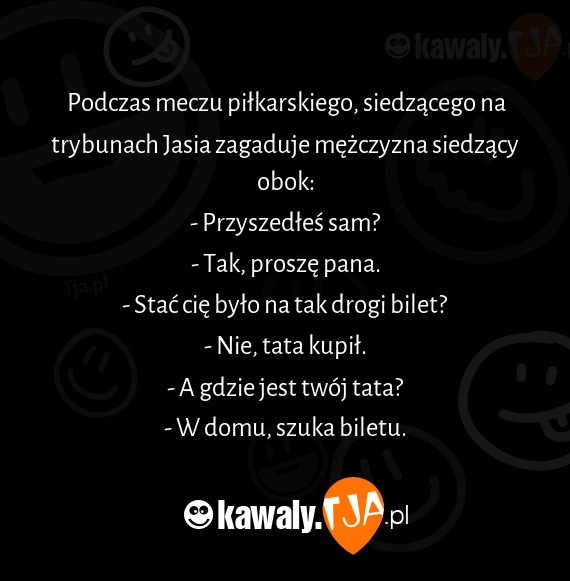 Podczas meczu piłkarskiego, siedzącego na trybunach Jasia zagaduje mężczyzna siedzący obok: - Przyszedłeś sam? - Tak, proszę pana. - Stać cię było na tak drogi bilet? - Nie, tata kupił. - A gdzie jest twój tata? - W domu, szuka biletu.