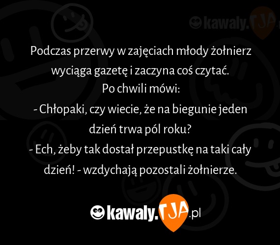 Podczas przerwy w zajęciach młody żołnierz wyciąga gazetę i zaczyna coś czytać. Po chwili mówi: - Chłopaki, czy wiecie, że na biegunie jeden dzień trwa pól roku? - Ech, żeby tak dostał przepustkę na taki cały dzień! - wzdychają pozostali żołnierze.