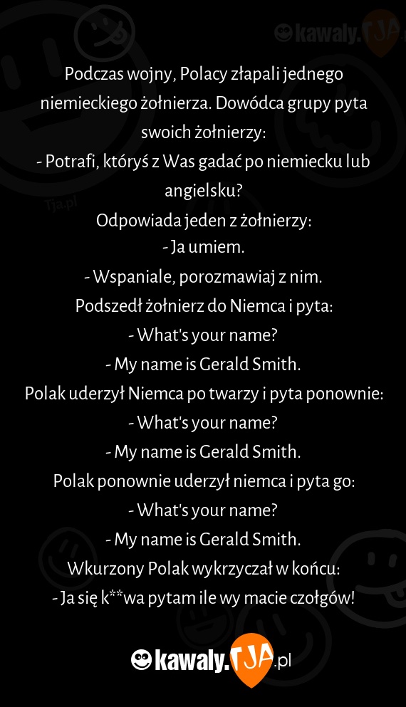Podczas wojny, Polacy złapali jednego niemieckiego żołnierza. Dowódca grupy pyta swoich żołnierzy: