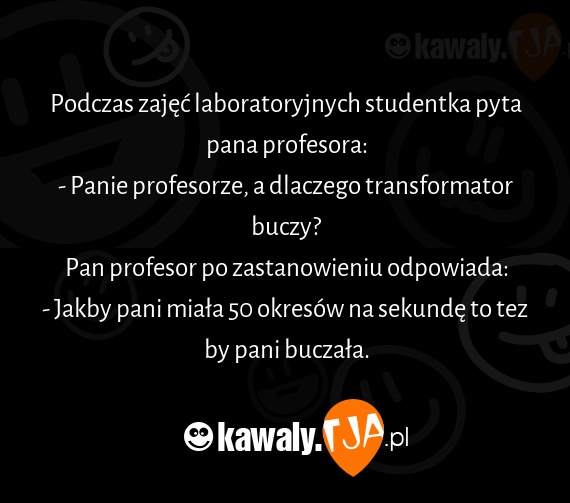 Podczas zajęć laboratoryjnych studentka pyta pana profesora: - Panie profesorze, a dlaczego transformator buczy? Pan profesor po zastanowieniu odpowiada: - Jakby pani miała 50 okresów na sekundę to tez by pani buczała.