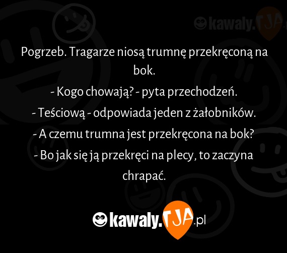 Pogrzeb. Tragarze niosą trumnę przekręconą na bok. - Kogo chowają? - pyta przechodzeń. - Teściową - odpowiada jeden z żałobników. - A czemu trumna jest przekręcona na bok? - Bo jak się ją przekręci na plecy, to zaczyna chrapać.