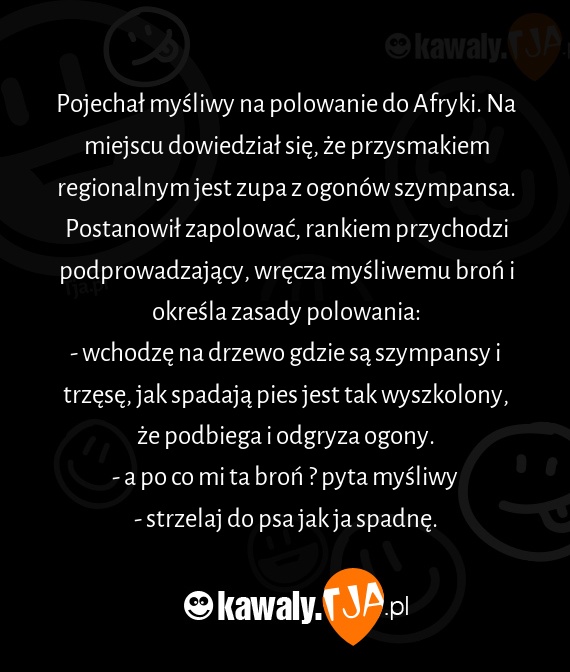 Pojechał myśliwy na polowanie do Afryki. Na miejscu dowiedział się, że przysmakiem regionalnym jest zupa z ogonów szympansa. Postanowił zapolować, rankiem przychodzi podprowadzający, wręcza myśliwemu broń i określa zasady polowania: