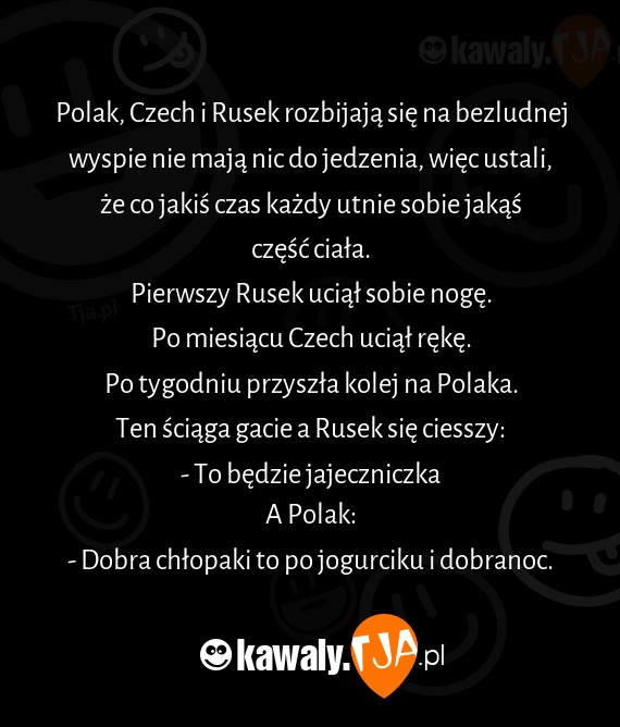 Polak, Czech i Rusek rozbijają się na bezludnej wyspie nie mają nic do jedzenia, więc ustali, że co jakiś czas każdy utnie sobie jakąś część ciała.