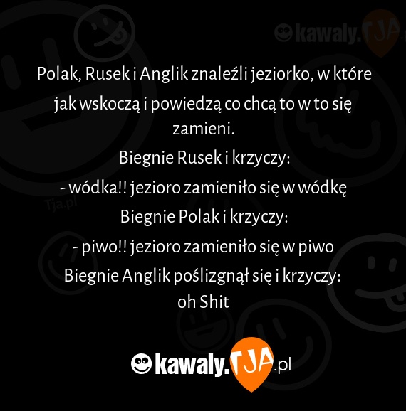Polak, Rusek i Anglik znaleźli jeziorko, w które jak wskoczą i powiedzą co chcą to w to się zamieni.