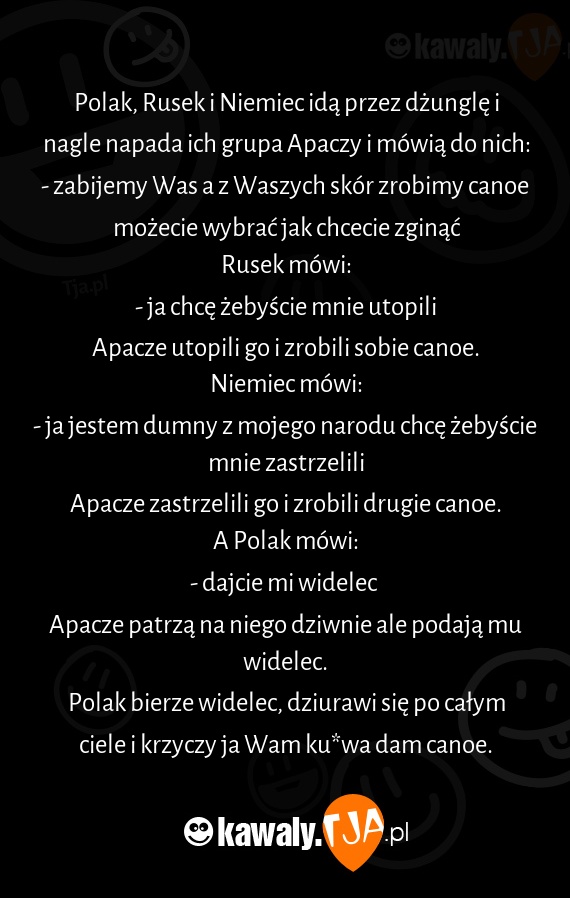 Polak, Rusek i Niemiec idą przez dżunglę i nagle napada ich grupa Apaczy i mówią do nich: