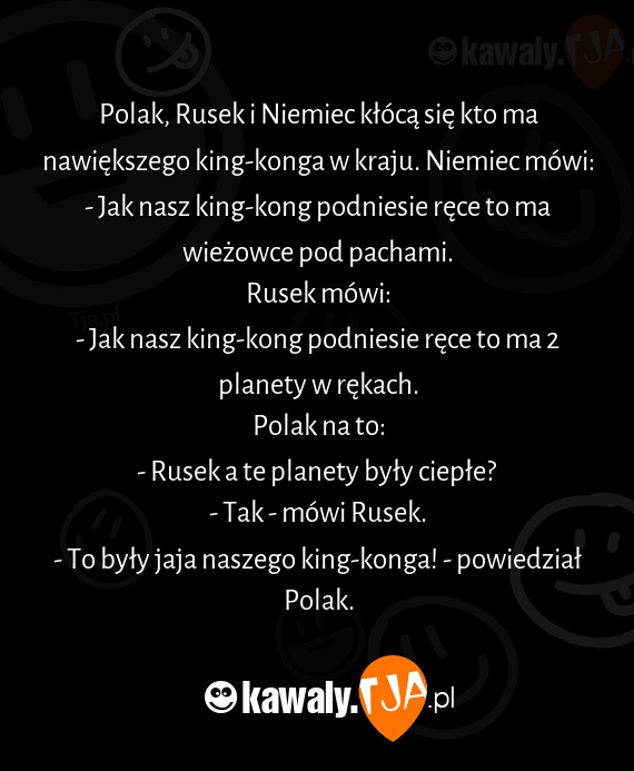 Polak, Rusek i Niemiec kłócą się kto ma nawiększego king-konga w kraju. Niemiec mówi:
