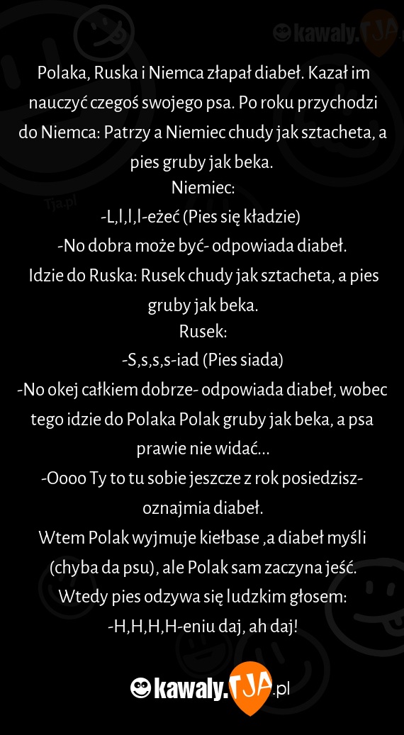 Polaka, Ruska i Niemca złapał diabeł. Kazał im nauczyć czegoś swojego psa. Po roku przychodzi do Niemca: Patrzy a Niemiec chudy jak sztacheta, a pies gruby jak beka.