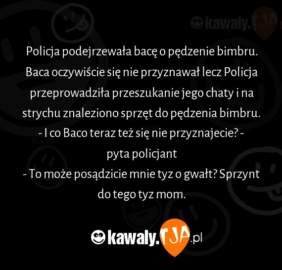 Baca oczywiście się nie przyznawał lecz Policja przeprowadziła przeszukanie jego chaty i na strychu znaleziono sprzęt do pędzenia bimbru.