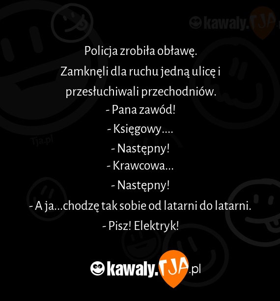 Policja zrobiła obławę. Zamknęli dla ruchu jedną ulicę i przesłuchiwali przechodniów. - Pana zawód! - Księgowy.... - Następny! - Krawcowa... - Następny! - A ja...chodzę tak sobie od latarni do latarni. - Pisz! Elektryk!