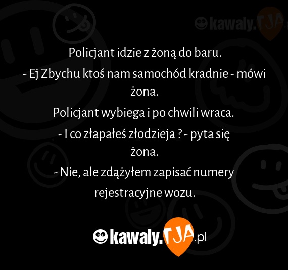 Policjant idzie z żoną do baru. - Ej Zbychu ktoś nam samochód kradnie - mówi żona. Policjant wybiega i po chwili wraca. - I co złapałeś złodzieja ? - pyta się żona. - Nie, ale zdążyłem zapisać numery rejestracyjne wozu.