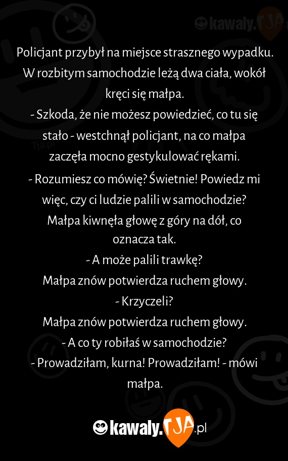 - Prowadziłam, kurna! Prowadziłam! - mówi małpa.