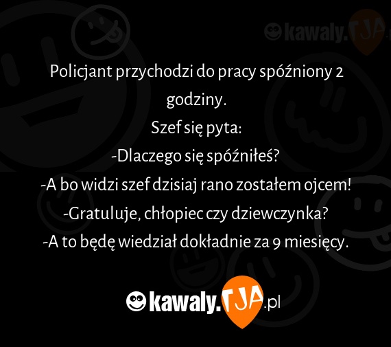 Policjant przychodzi do pracy spóźniony 2 godziny. Szef się pyta: -Dlaczego się spóźniłeś? -A bo widzi szef dzisiaj rano zostałem ojcem! -Gratuluje, chłopiec czy dziewczynka? -A to będę wiedział dokładnie za 9 miesięcy.