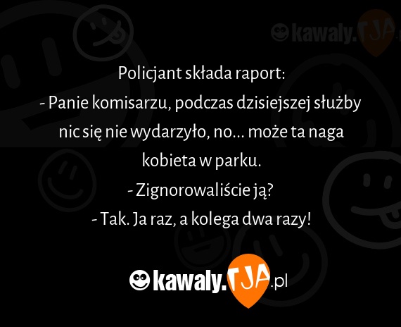 Policjant składa raport: - Panie komisarzu, podczas dzisiejszej służby nic się nie wydarzyło, no... może ta naga kobieta w parku. - Zignorowaliście ją? - Tak. Ja raz, a kolega dwa razy!