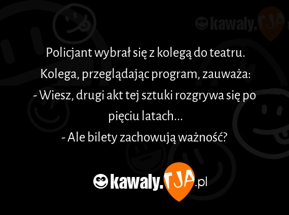 Policjant wybrał się z kolegą do teatru. Kolega, przeglądając program, zauważa: - Wiesz, drugi akt tej sztuki rozgrywa się po pięciu latach... - Ale bilety zachowują ważność?