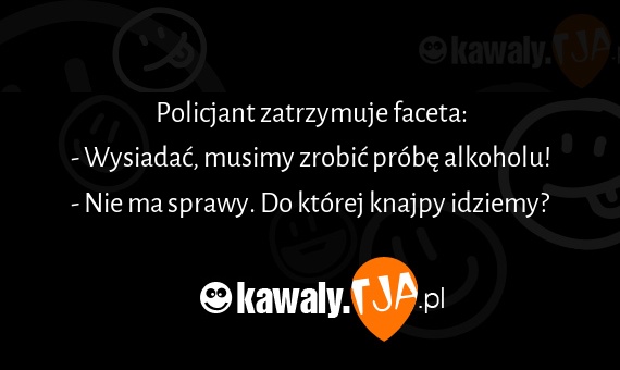 Policjant zatrzymuje faceta: - Wysiadać, musimy zrobić próbę alkoholu! - Nie ma sprawy. Do której knajpy idziemy?