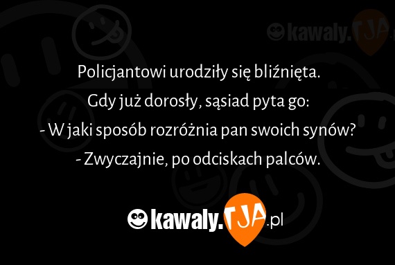 Policjantowi urodziły się bliźnięta. Gdy już dorosły, sąsiad pyta go: - W jaki sposób rozróżnia pan swoich synów? - Zwyczajnie, po odciskach palców.