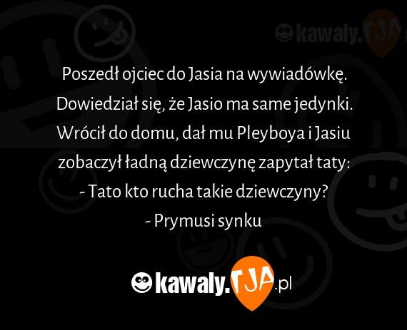 Poszedł ojciec do Jasia na wywiadówkę. Dowiedział się, że Jasio ma same jedynki. Wrócił do domu, dał mu Pleyboya i Jasiu zobaczył ładną dziewczynę zapytał taty: - Tato kto rucha takie dziewczyny? - Prymusi synku
