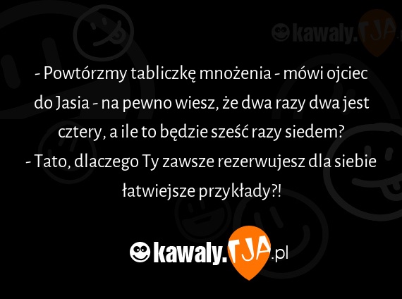 - Powtorzmy tabliczke mnozenia - mowi ojciec do Jasia - na pewno wiesz, ze dwa razy dwa jest cztery, a ile to bedzie szesc razy siedem? - Tato, dlaczego Ty zawsze rezerwujesz dla siebie latwiejsze przyklady?!