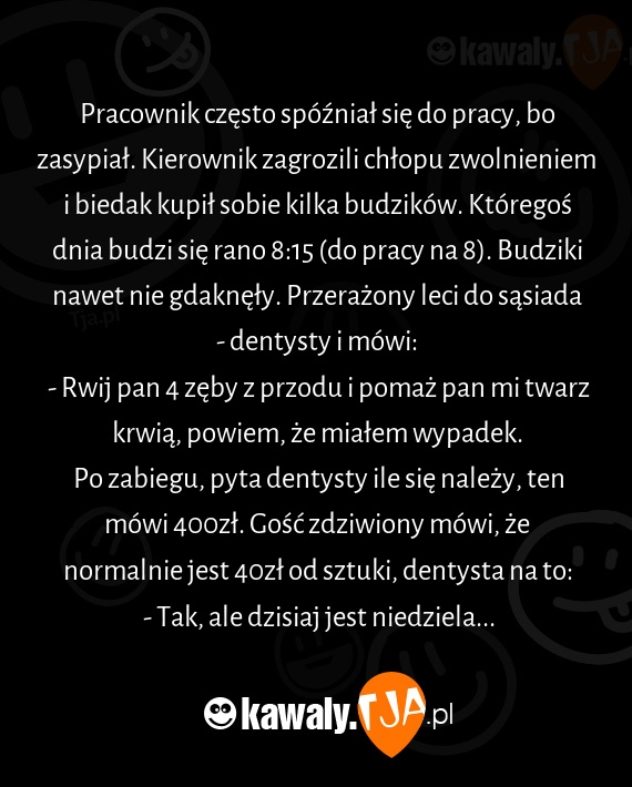 Pracownik często spóźniał się do pracy, bo zasypiał. Kierownik zagrozili chłopu zwolnieniem i biedak kupił sobie kilka budzików. Któregoś dnia budzi się rano 8:15 (do pracy na 8). Budziki nawet nie gdaknęły. Przerażony leci do sąsiada - dentysty i mówi: