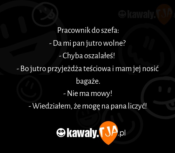 Pracownik do szefa: - Da mi pan jutro wolne? - Chyba oszalales! - Bo jutro przyjezdza tesciowa i mam jej nosic bagaze. - Nie ma mowy! - Wiedzialem, ze moge na pana liczyc!