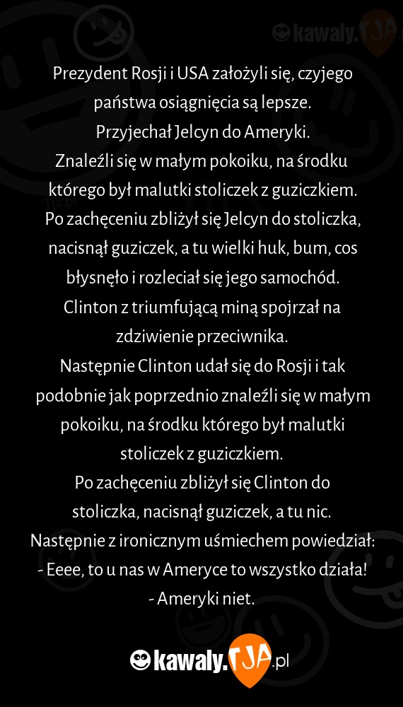 Po zachęceniu zbliżył się Jelcyn do stoliczka, nacisnął guziczek, a tu wielki huk, bum, cos błysnęło i rozleciał się jego samochód.
