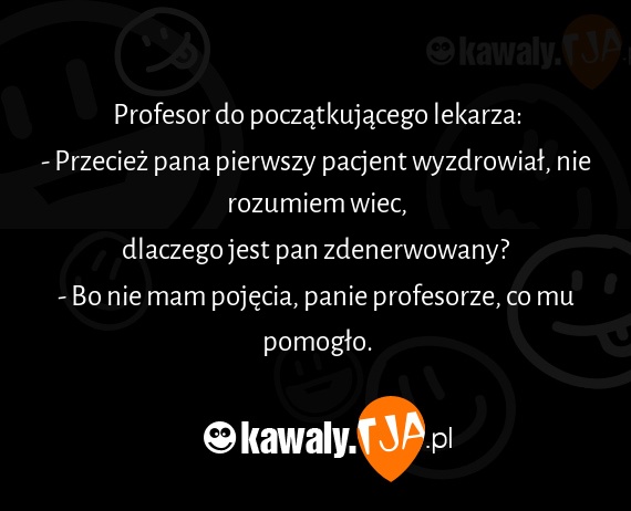 Profesor do poczatkujacego lekarza: - Przeciez pana pierwszy pacjent wyzdrowial, nie rozumiem wiec, dlaczego jest pan zdenerwowany? - Bo nie mam pojecia, panie profesorze, co mu pomoglo.