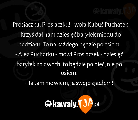 - Ależ Puchatku - mówi Prosiaczek - dziesięć baryłek na dwóch, to będzie po pięć, nie po osiem.