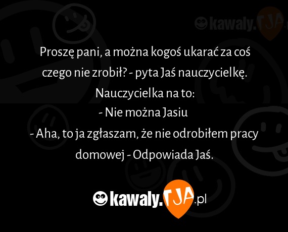 Proszę pani, a można kogoś ukarać za coś czego nie zrobił? - pyta Jaś nauczycielkę. Nauczycielka na to: - Nie można Jasiu - Aha, to ja zgłaszam, że nie odrobiłem pracy domowej - Odpowiada Jaś.