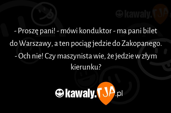 - Proszę pani! - mówi konduktor - ma pani bilet do Warszawy, a ten pociąg jedzie do Zakopanego. - Och nie! Czy maszynista wie, że jedzie w złym kierunku?