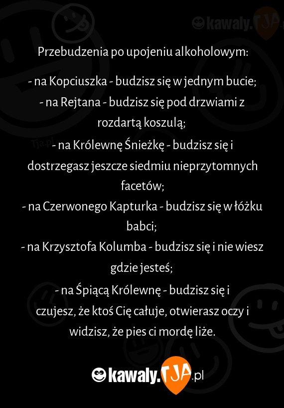 - na Śpiącą Królewnę - budzisz się i czujesz, że ktoś Cię całuje, otwierasz oczy i widzisz, że pies ci mordę liże.