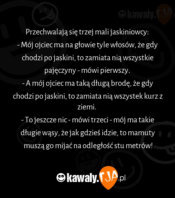 - Mój ojciec ma na głowie tyle włosów, że gdy chodzi po jaskini, to zamiata nią wszystkie pajęczyny - mówi pierwszy.
