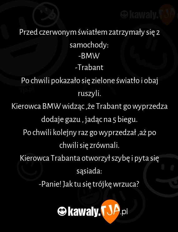 Kierowca BMW widząc ,że Trabant go wyprzedza dodaje gazu , jadąc na 5 biegu.