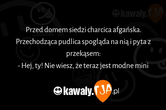 Przed domem siedzi charcica afganska. Przechodzaca pudlica spoglada na nia i pyta z przekasem: - Hej, ty! Nie wiesz, ze teraz jest modne mini