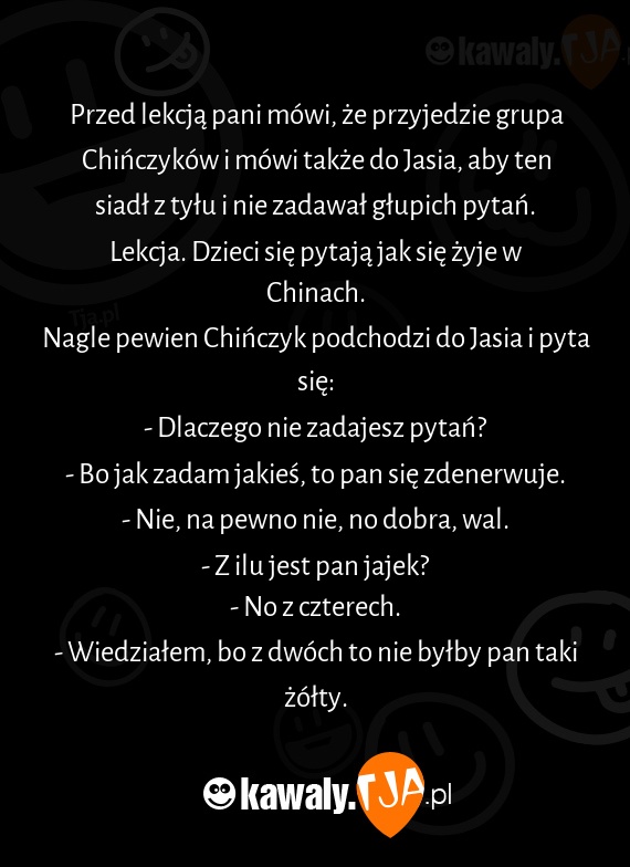 Przed lekcją pani mówi, że przyjedzie grupa Chińczyków i mówi także do Jasia, aby ten siadł z tyłu i nie zadawał głupich pytań.