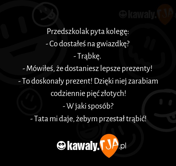 Przedszkolak pyta kolegę: - Co dostałeś na gwiazdkę? - Trąbkę. - Mówiłeś, że dostaniesz lepsze prezenty! - To doskonały prezent! Dzięki niej zarabiam codziennie pięć złotych! - W jaki sposób? - Tata mi daje, żebym przestał trąbić!