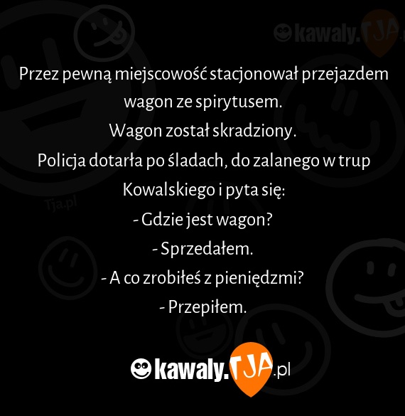 Przez pewną miejscowość stacjonował przejazdem wagon ze spirytusem. Wagon został skradziony. Policja dotarła po śladach, do zalanego w trup Kowalskiego i pyta się: - Gdzie jest wagon? - Sprzedałem. - A co zrobiłeś z pieniędzmi? - Przepiłem.