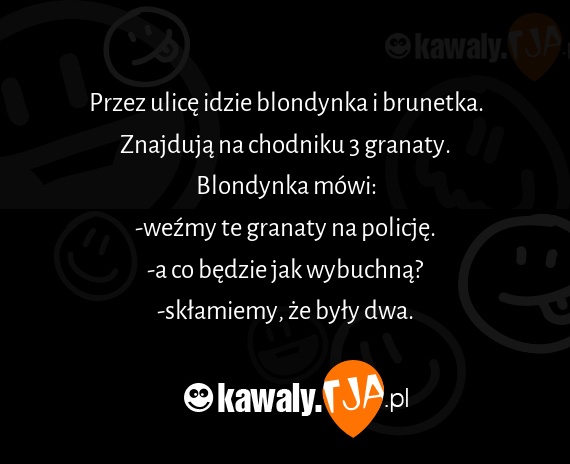 Przez ulicę idzie blondynka i brunetka. Znajdują na chodniku 3 granaty. Blondynka mówi: -weźmy te granaty na policję. -a co będzie jak wybuchną? -skłamiemy, że były dwa.