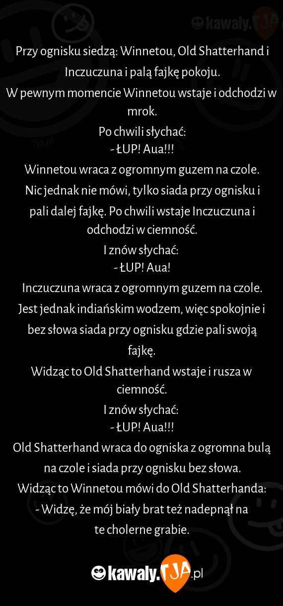 Jest jednak indiańskim wodzem, więc spokojnie i bez słowa siada przy ognisku gdzie pali swoją fajkę.