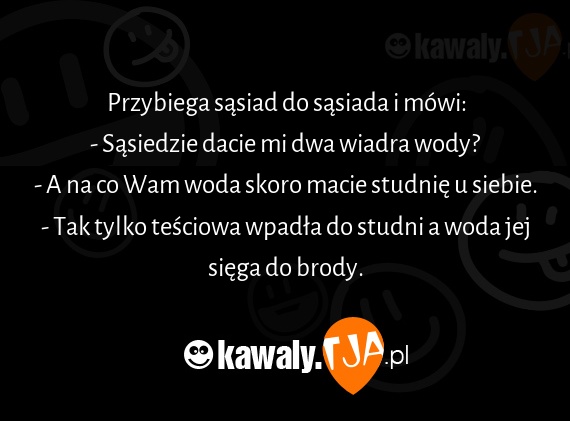 Przybiega sąsiad do sąsiada i mówi: - Sąsiedzie dacie mi dwa wiadra wody? - A na co Wam woda skoro macie studnię u siebie. - Tak tylko teściowa wpadła do studni a woda jej sięga do brody.