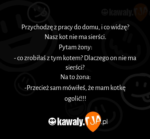 Przychodze z pracy do domu, i co widze? Nasz kot nie ma siersci. Pytam zony: - co zrobilas z tym kotem? Dlaczego on nie ma siersci? Na to zona: -Przeciez sam mowiles, ze mam kotke ogolic!!!