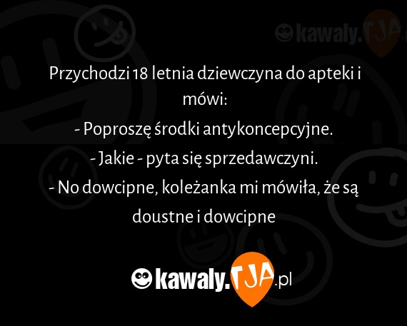 Przychodzi 18 letnia dziewczyna do apteki i mowi: - Poprosze srodki antykoncepcyjne. - Jakie - pyta sie sprzedawczyni. - No dowcipne, kolezanka mi mowila, ze sa doustne i dowcipne
