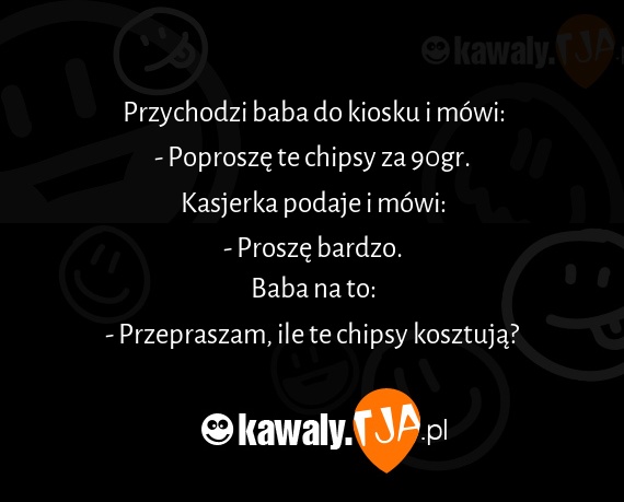 Przychodzi baba do kiosku i mowi: - Poprosze te chipsy za 90gr. Kasjerka podaje i mowi: - Prosze bardzo. Baba na to: - Przepraszam, ile te chipsy kosztuja?