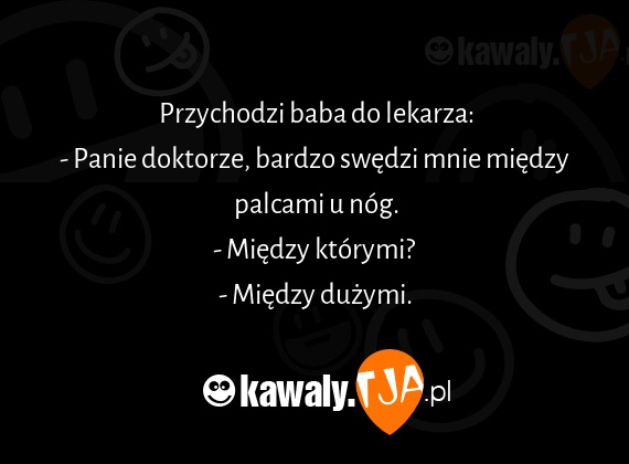 Przychodzi baba do lekarza: - Panie doktorze, bardzo swedzi mnie miedzy palcami u nog. - Miedzy ktorymi? - Miedzy duzymi.
