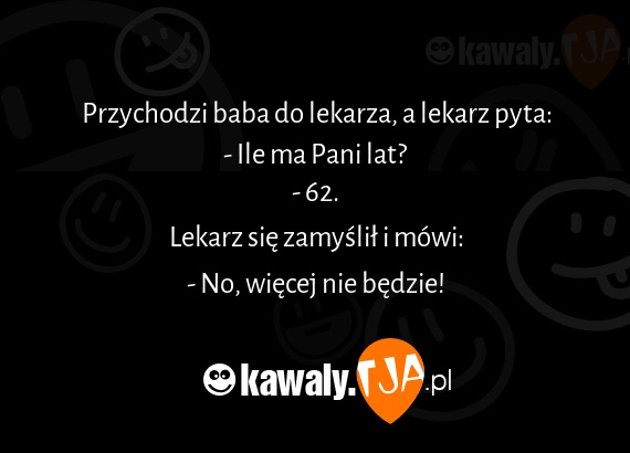 Przychodzi baba do lekarza, a lekarz pyta: - Ile ma Pani lat? - 62. Lekarz się zamyślił i mówi: - No, więcej nie będzie!