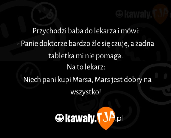 Przychodzi baba do lekarza i mowi: - Panie doktorze bardzo xle sie czuje, a zadna tabletka mi nie pomaga. Na to lekarz: - Niech pani kupi Marsa, Mars jest dobry na wszystko!