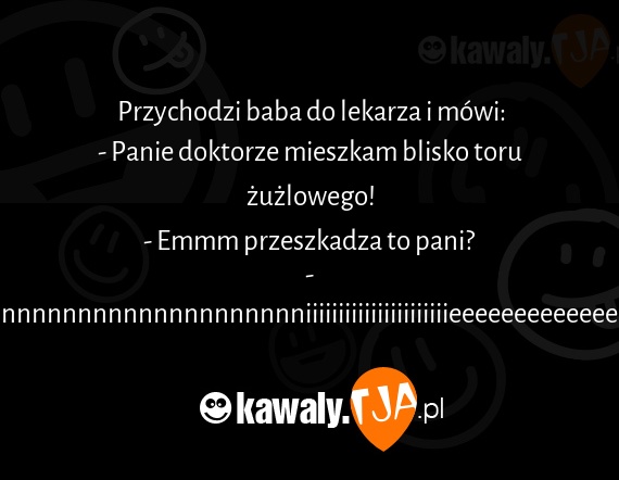 Przychodzi baba do lekarza i mowi: - Panie doktorze mieszkam blisko toru zuzlowego! - Emmm przeszkadza to pani? - Nnnnnnnnnnnnnnnnnnnnnnnnniiiiiiiiiiiiiiiiiiiiiieeeeeeeeeeeeeeeeeee!