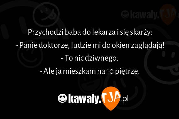 Przychodzi baba do lekarza i się skarży: - Panie doktorze, ludzie mi do okien zaglądają! - To nic dziwnego. - Ale ja mieszkam na 10 piętrze.