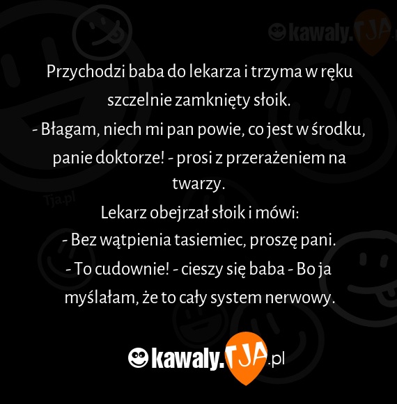 Przychodzi baba do lekarza i trzyma w ręku szczelnie zamknięty słoik.