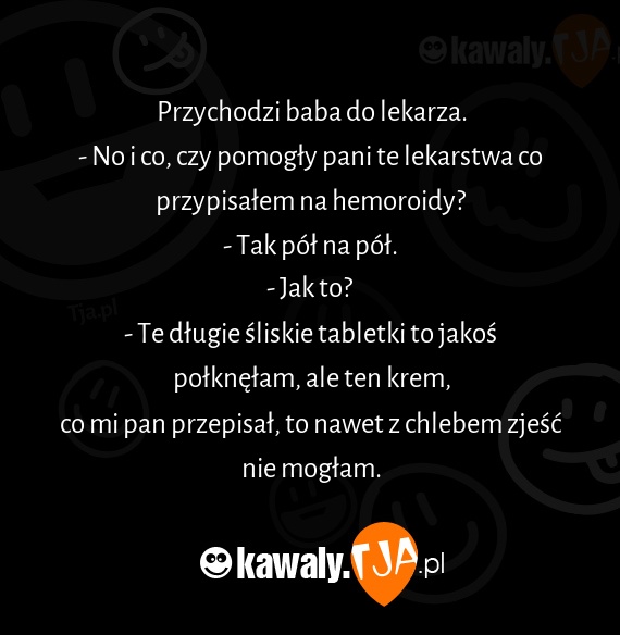 Przychodzi baba do lekarza. - No i co, czy pomogły pani te lekarstwa co przypisałem na hemoroidy? - Tak pół na pół. - Jak to? - Te długie śliskie tabletki to jakoś połknęłam, ale ten krem, co mi pan przepisał, to nawet z chlebem zjeść nie mogłam.