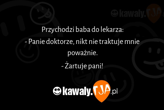 Przychodzi baba do lekarza: - Panie doktorze, nikt nie traktuje mnie powaznie. - Zartuje pani!